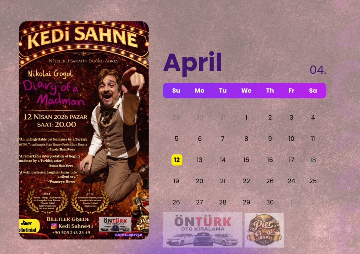 ​Gogol’ün ölümsüz eseri “Bir Delinin Hatıra Defteri”, usta oyuncu Erdem Topuz’un çarpıcı yorumuyla İzmitli sanatseverlerle buluşuyor.​Sıradan bir memur olan Poprişçin’in zihnindeki sınırların bulanıklaşmasını, toplumsal hiyerarşinin insan ruhunda açtığı derin yaraları ve delilikle dahilik arasındaki o ince çizgiyi sahneye taşıyan oyun, seyirciye unutulmaz bir deneyim vaat ediyor. Erdem Topuz, karakterin yaşadığı içsel çatışmaları ve dramatik dönüşümü adeta yaşayarak sahneye yansıtıyor.​Etkinlik Detayları​Oyun: Bir Delinin Hatıra Defteri​Oyuncu: Erdem Topuz​Tarih: 12 Nisan 2026​Yer: Kedi Sahne, İzmit Saat :20:00​Unutmayın!​Bu sarsıcı performansa tanıklık etmek ve zihnin kıvrımlarında yolculuğa çıkmak için yerinizi şimdiden ayırtın. Yoğun ilgi görmesi beklenen oyun için biletlerinizi almayı unutmayın.​”Küçük bir adamın, büyük dünyadaki kayboluşuna şahitlik edeceksiniz.”​Kültür ve sanat dolu bu akşamda görüşmek dileğiyle!